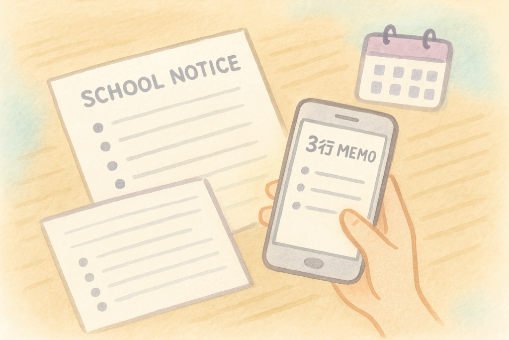 学校プリントを撮影すると文字を読み取り、「日付・持ち物・提出期限」だけ3行にまとめてくれる機能です。