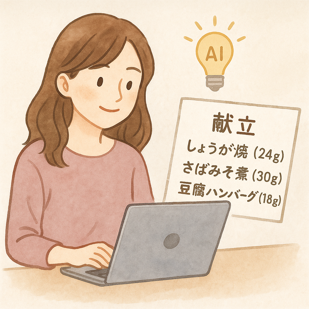 その提案では、主菜のところに**推定のたんぱく質量(g)**を併記してもらうようにすると、不足分を自然に意識できました。